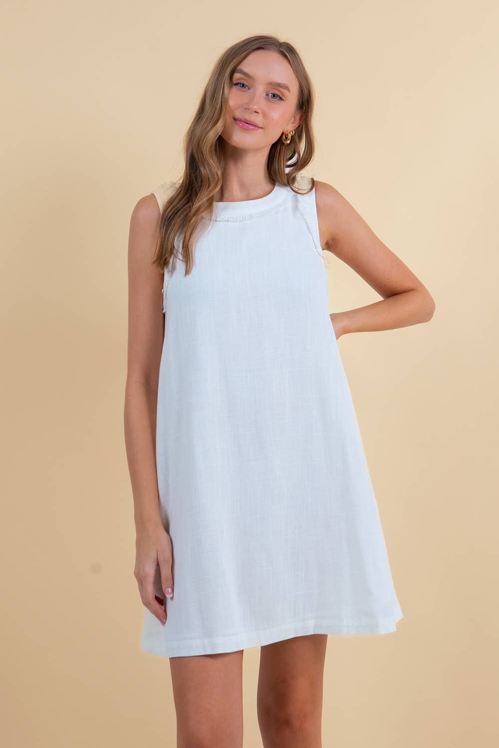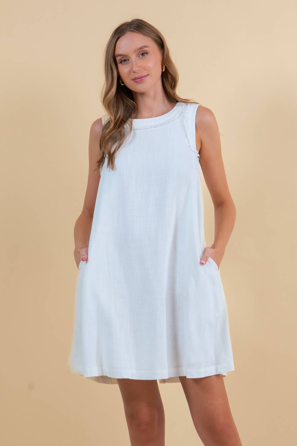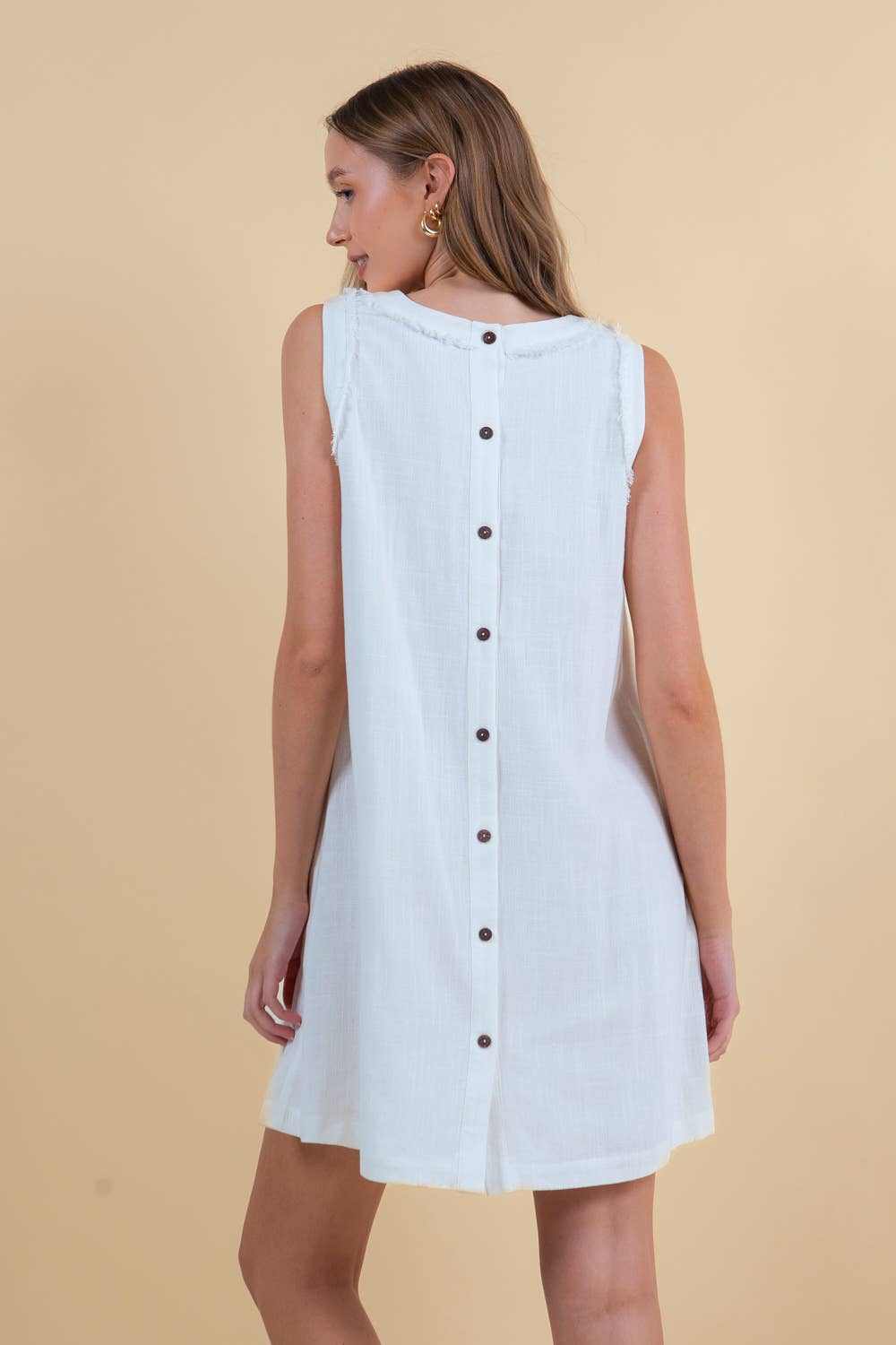 Unit price perLINEN BLEND ROUND NECK SLEEVELESS BACK BUTTON MINI DRESS W/ FRAY DETAIL