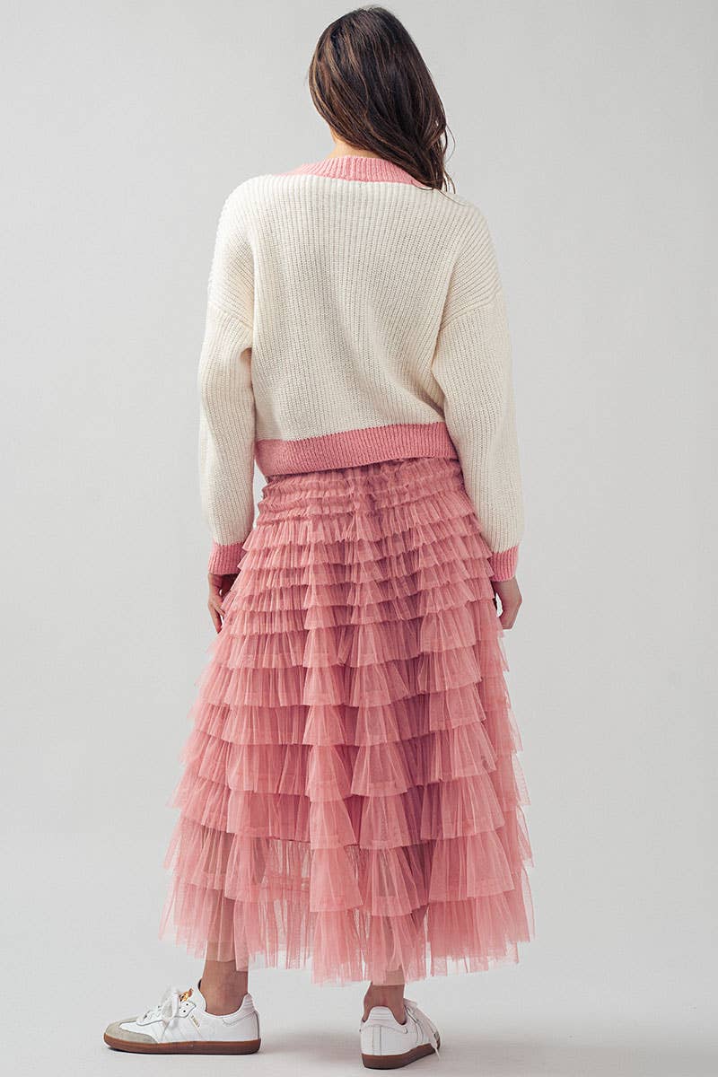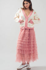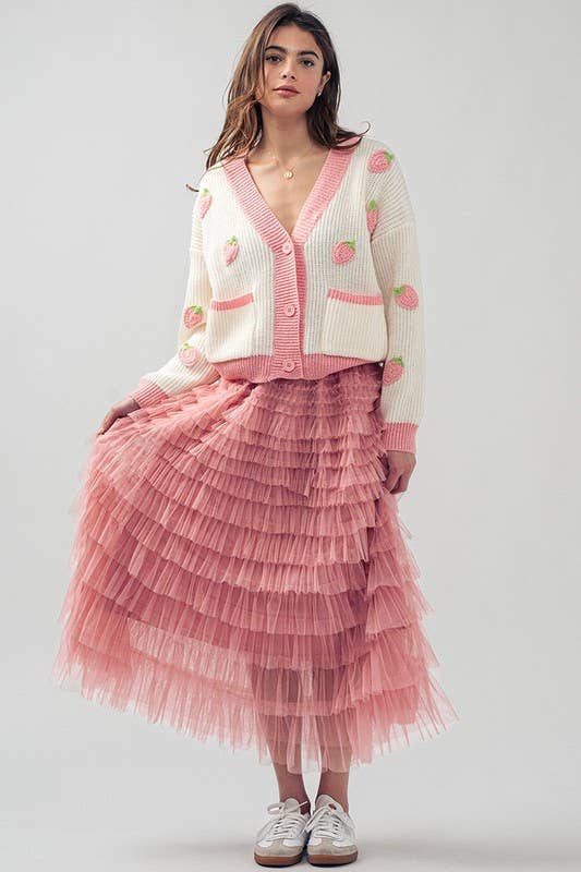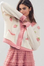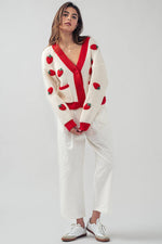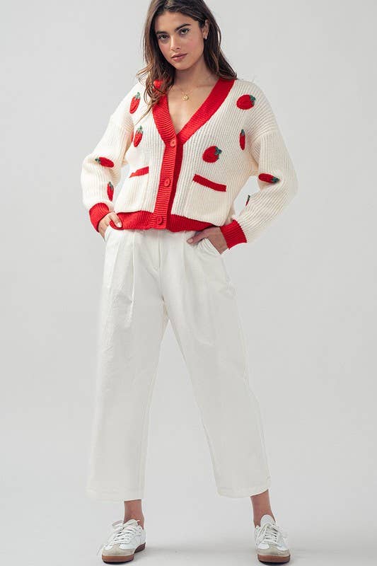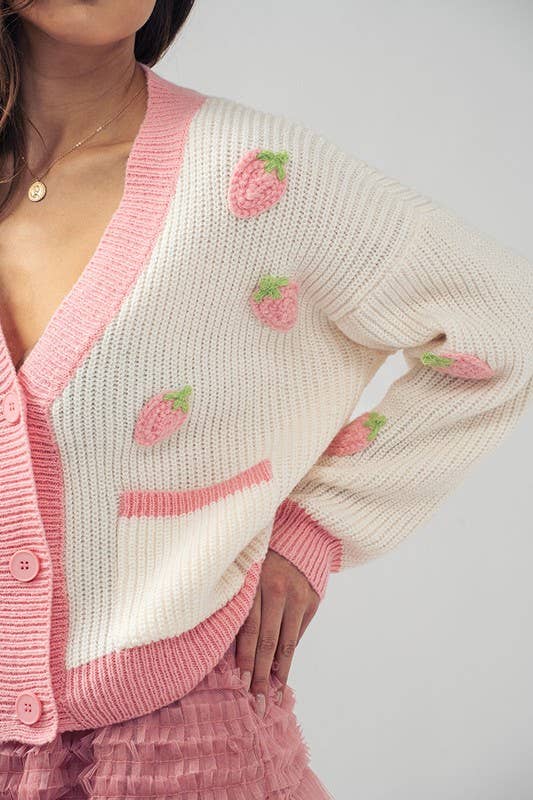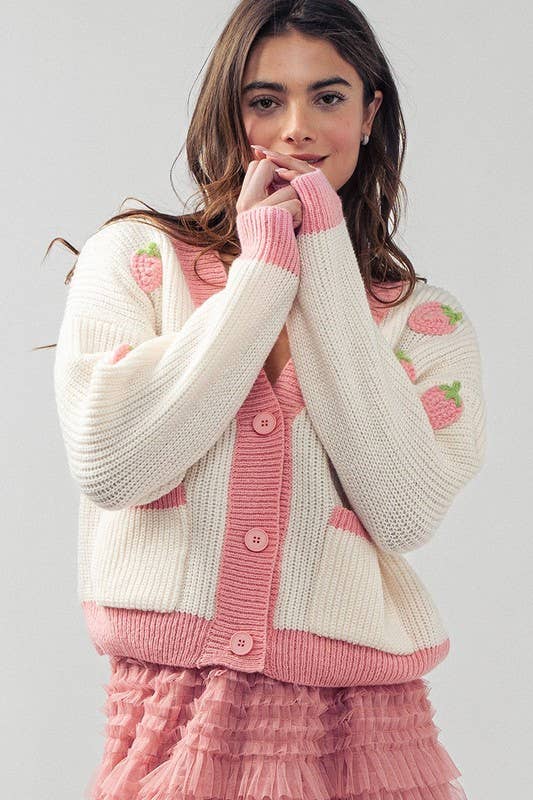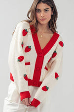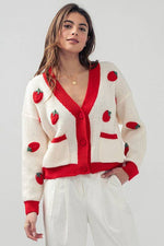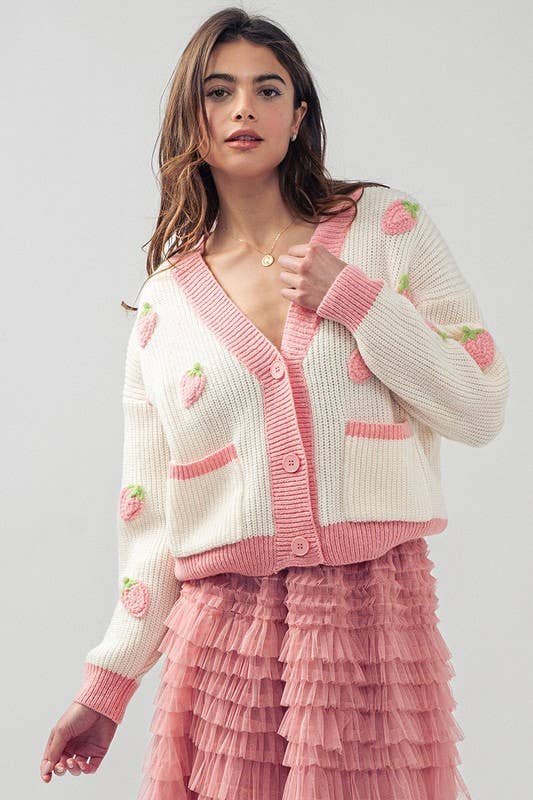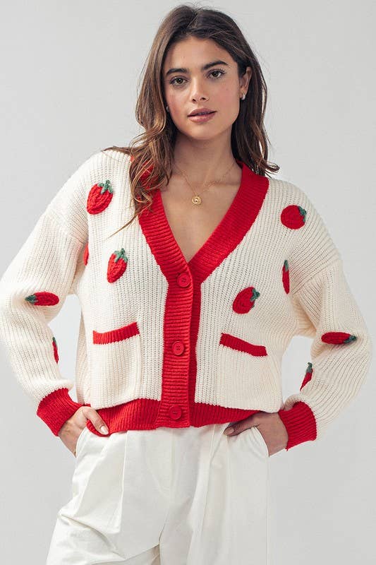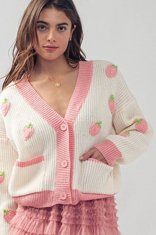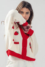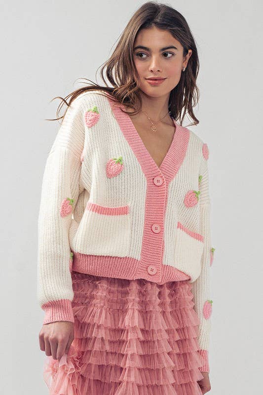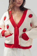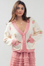 Unit price perSweet and charming chunky knit cardigan featuring whimsical embroidered strawberries throughout. The deep V-neckline and contrast red trim create a playful silhouette, while front pockets add practical comfort. Perfect for valentine's day or everyday wear.